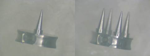微型頂針有各式各樣的形狀和用途。本次開發(fā)的案件是在醫(yī)療器械的前端安裝微型頂針,固定在患者的頭皮處,通過(guò)微電流起到止痛的效果。醫(yī)療用機(jī)械必須是高品質(zhì)的。不僅在醫(yī)院能由專業(yè)人事為患者操作,患者也能自己在家使用。為了能夠?qū)崿F(xiàn)這一想法,并且考慮到非專業(yè)人士操作時(shí)頂針刺入頭皮的痛感,刺入前端極細(xì)才能滿足。現(xiàn)在市場(chǎng)上在流通的針頭,瑞士制造的市場(chǎng)占比很大,加工費(fèi)和材料費(fèi)非常的昂貴。
