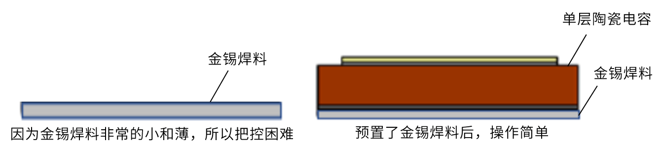 一直以來金錫焊料的使用是放置于電容和基板之間,那么作為環(huán)氧樹脂的替代品就需要把金錫焊料設(shè)置成片狀。但是,片狀的金錫焊料特別的薄和小,在拼貼操作上不僅把控困難,也會發(fā)生因設(shè)置的位置偏移而短路。