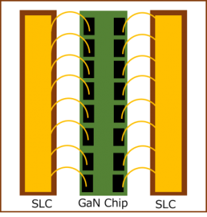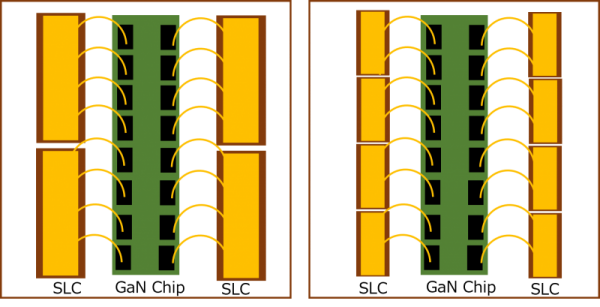 Tecdia成功研制出了能夠與GaN芯片尺寸完美匹配的矩形單層陶瓷電容。一般來(lái)說(shuō)電容的長(zhǎng)寬極限比為1:3,而突破這層極限調(diào)整比例為 1:6的話不但可以免去使用多個(gè)電容排列,同時(shí)還能夠減少部件的封裝數(shù)量,降本增效。