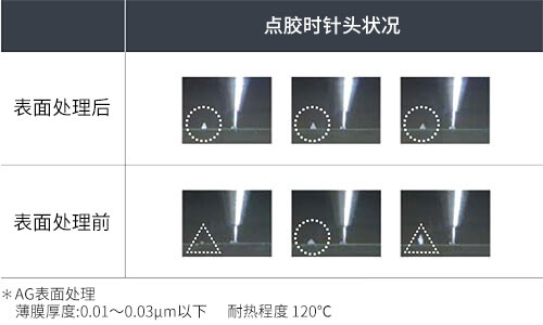 精準(zhǔn)點(diǎn)膠的秘訣在于抑制出膠量不均,材料拉絲,前端爬膠等現(xiàn)象,進(jìn)一步實(shí)現(xiàn)高品質(zhì)的點(diǎn)膠。 在點(diǎn)膠針頭前端及內(nèi)徑進(jìn)行特殊材料的表面處理,可以實(shí)現(xiàn)更精準(zhǔn)的點(diǎn)膠。請(qǐng)依照使用目的與用途來選擇表面處理的種類。